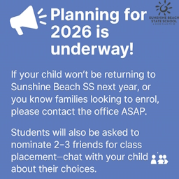 If your child will not be returning to Sunshine Beach State School in 2026, please notify the school office as soon as possible.